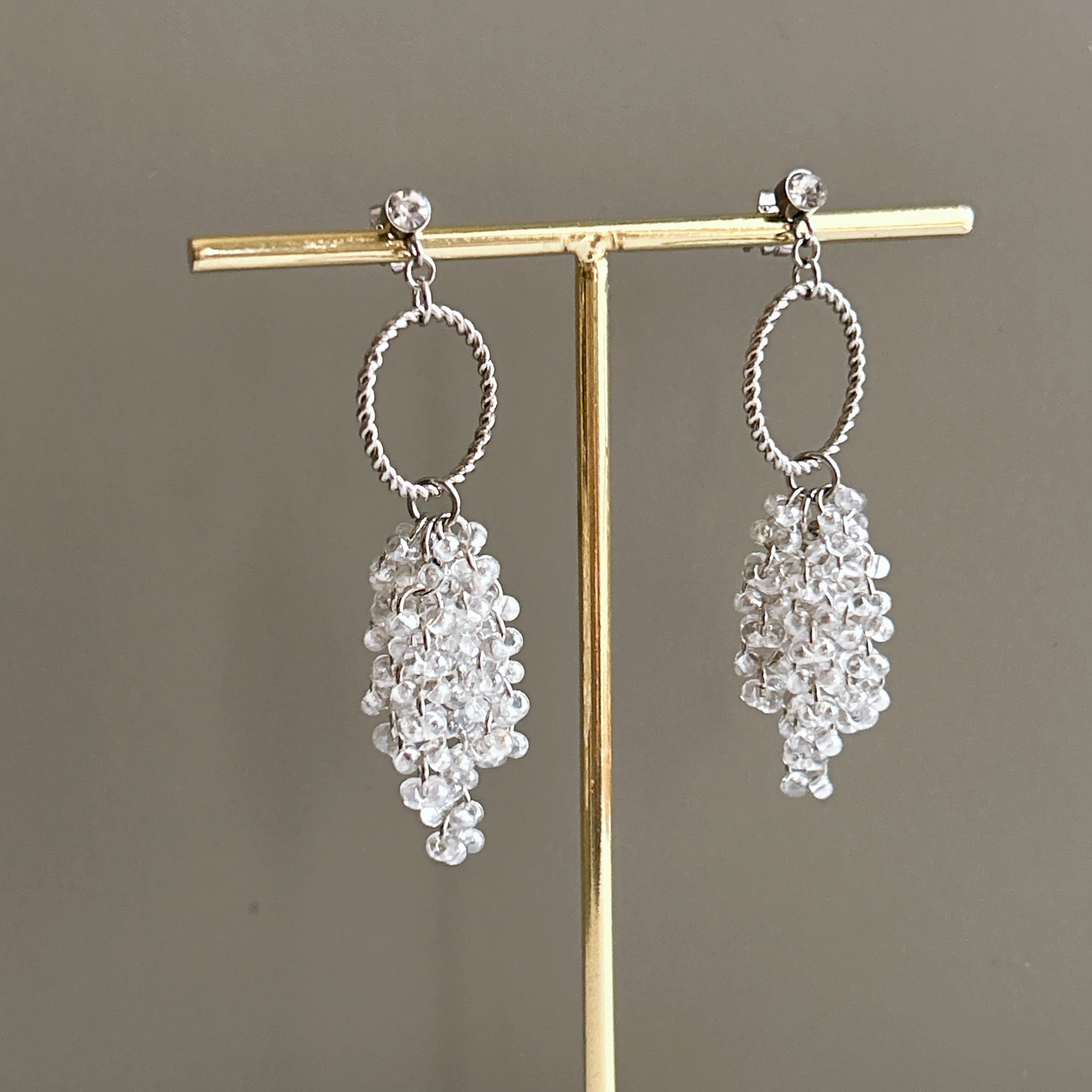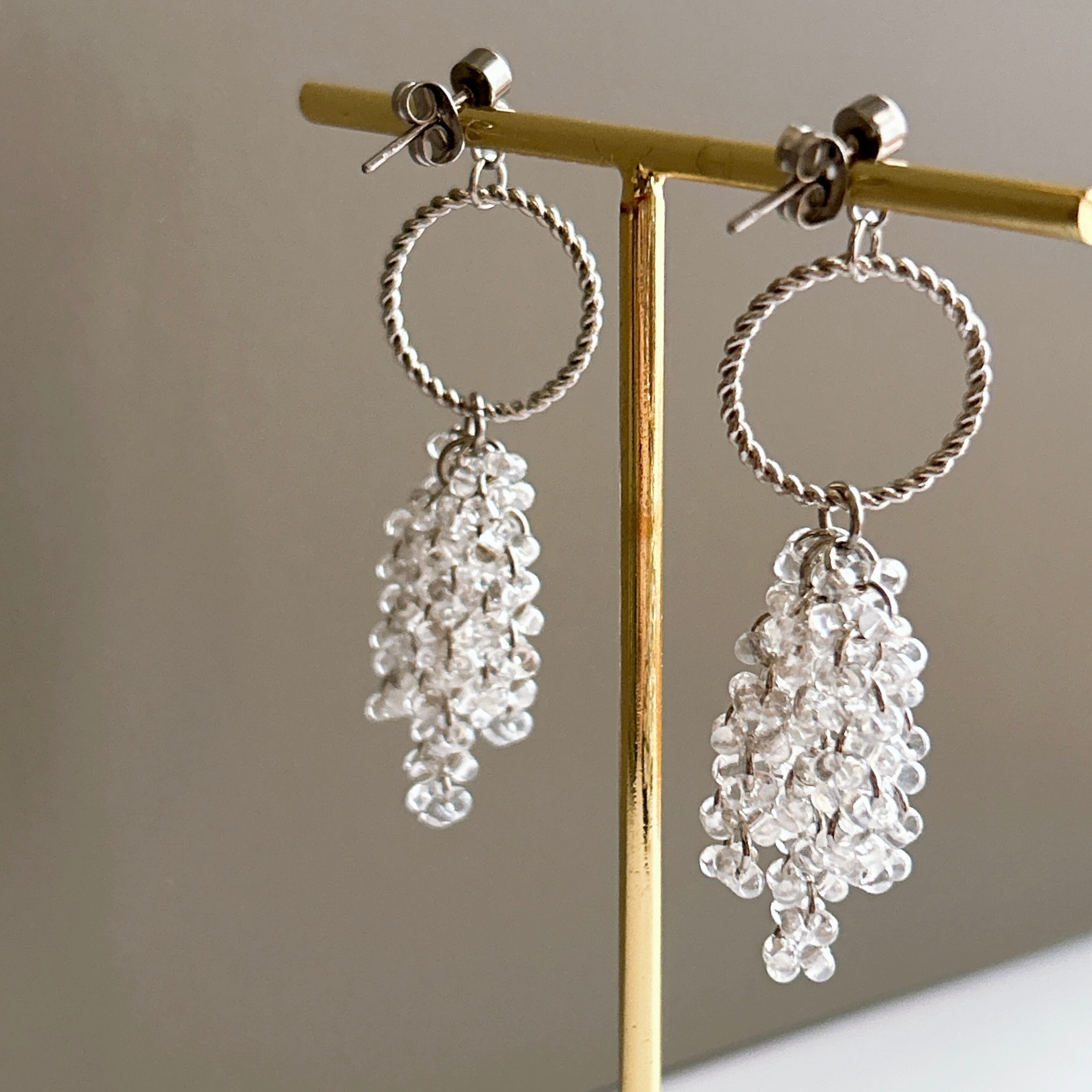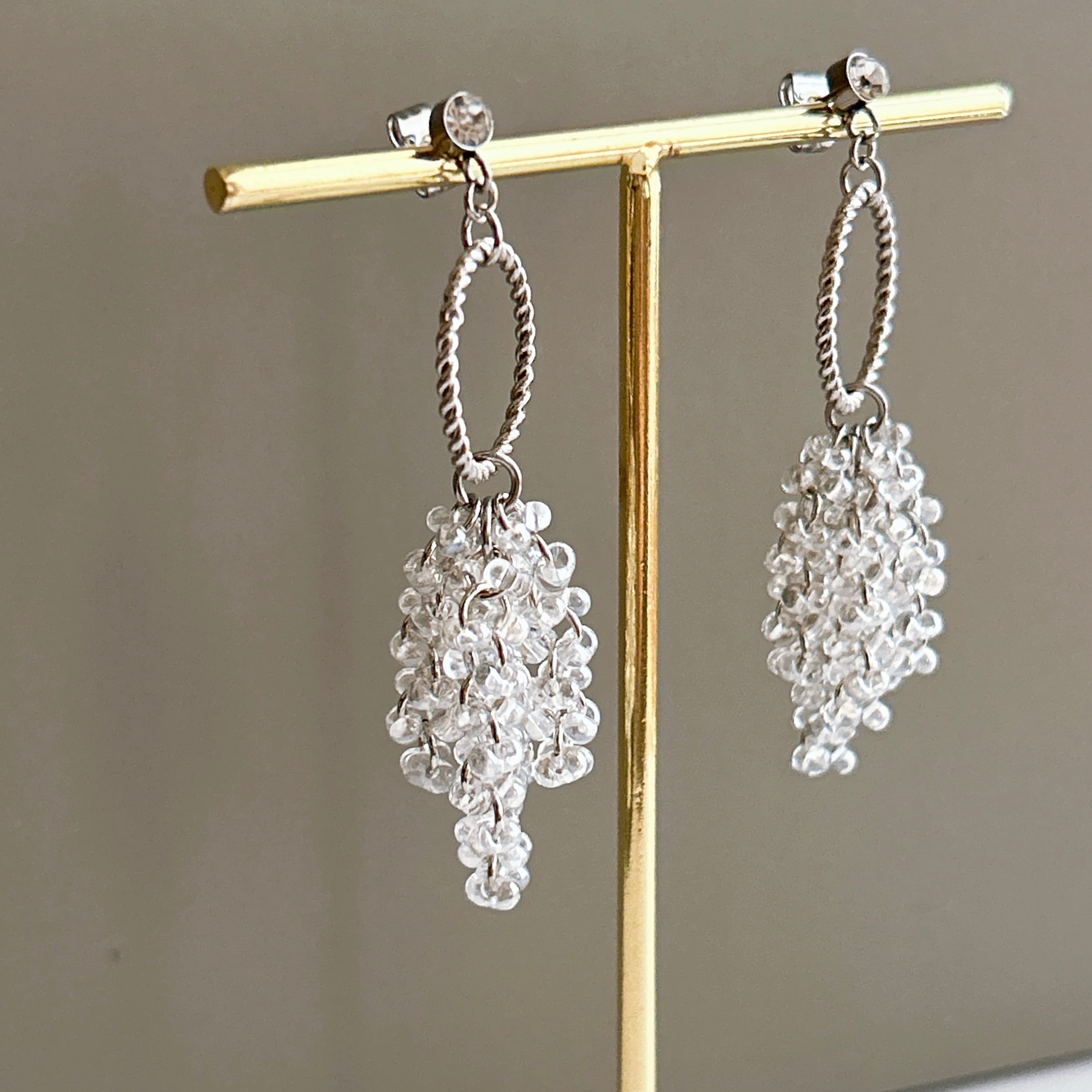 まるで氷の結晶が集まったように輝く、透明ファルファーレガラスビーズのピアス。