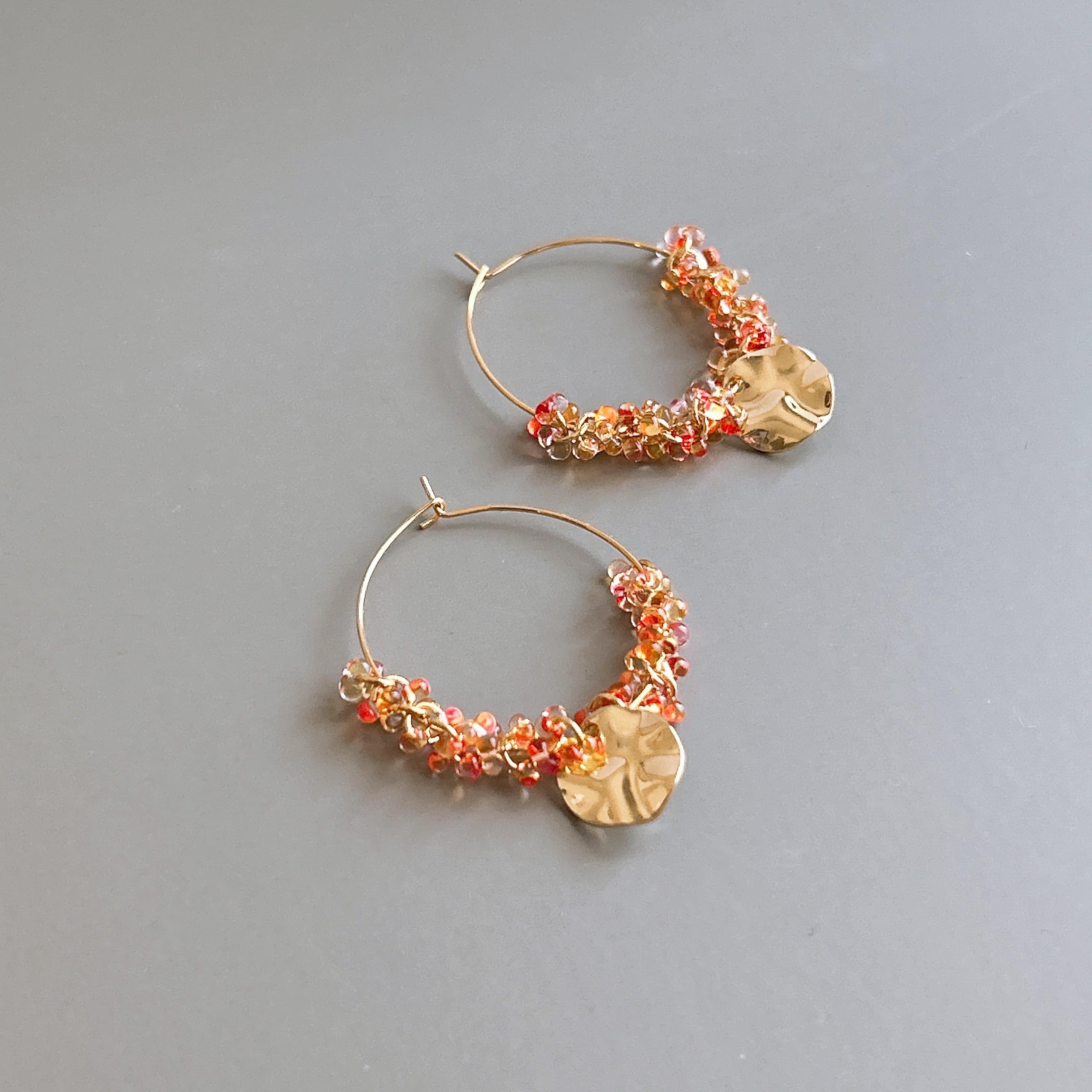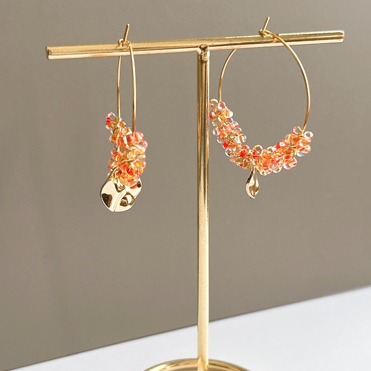 陽射しのように明るいオレンジのファルファーレビーズと、きらめくゴールドチャームを組み合わせたフープピアス。