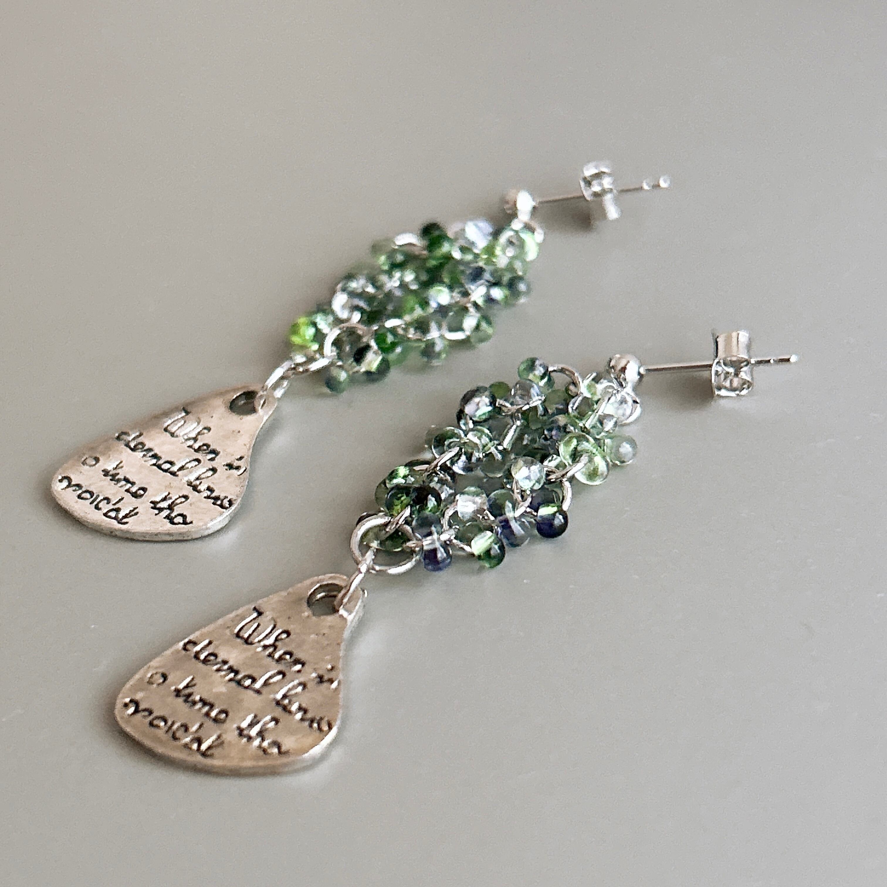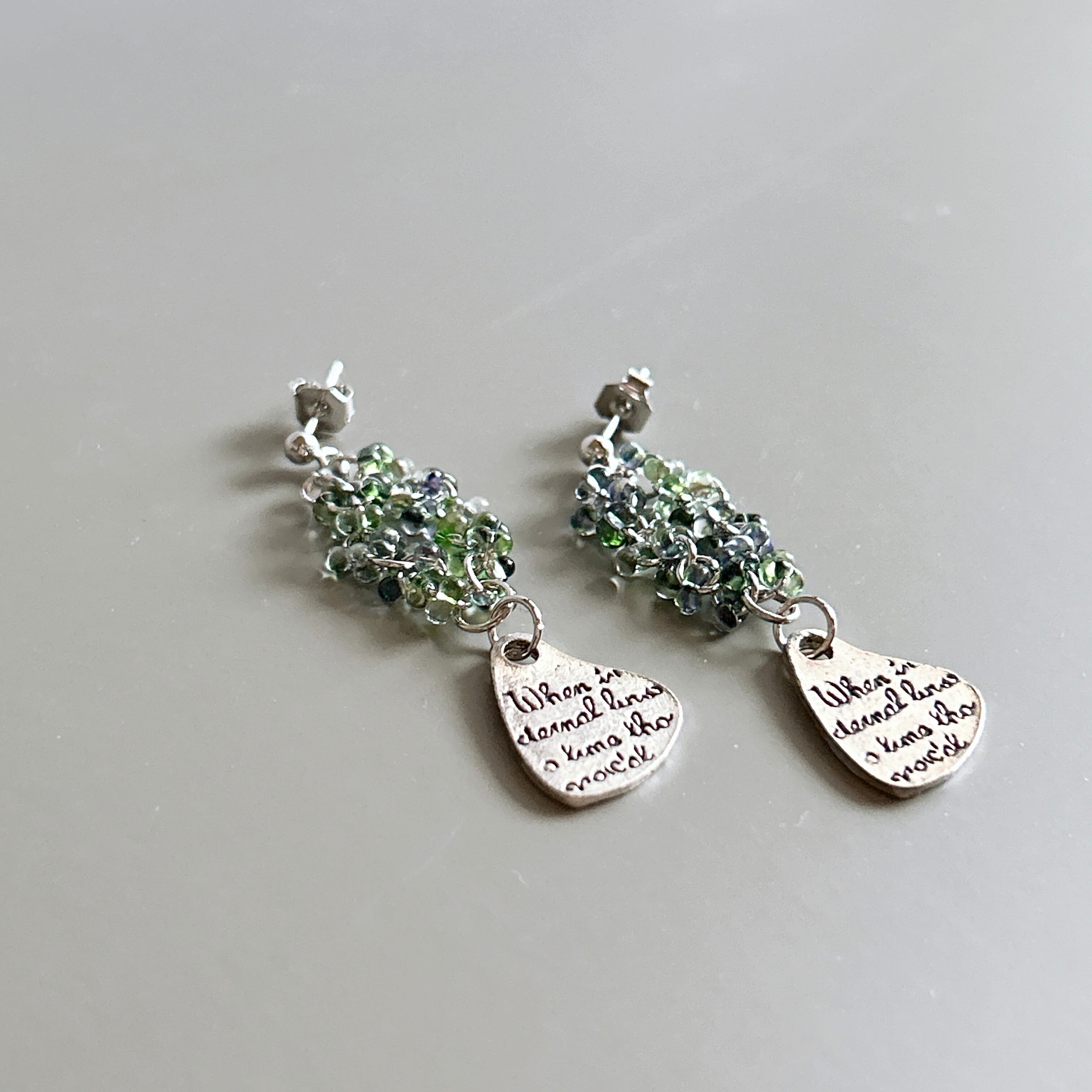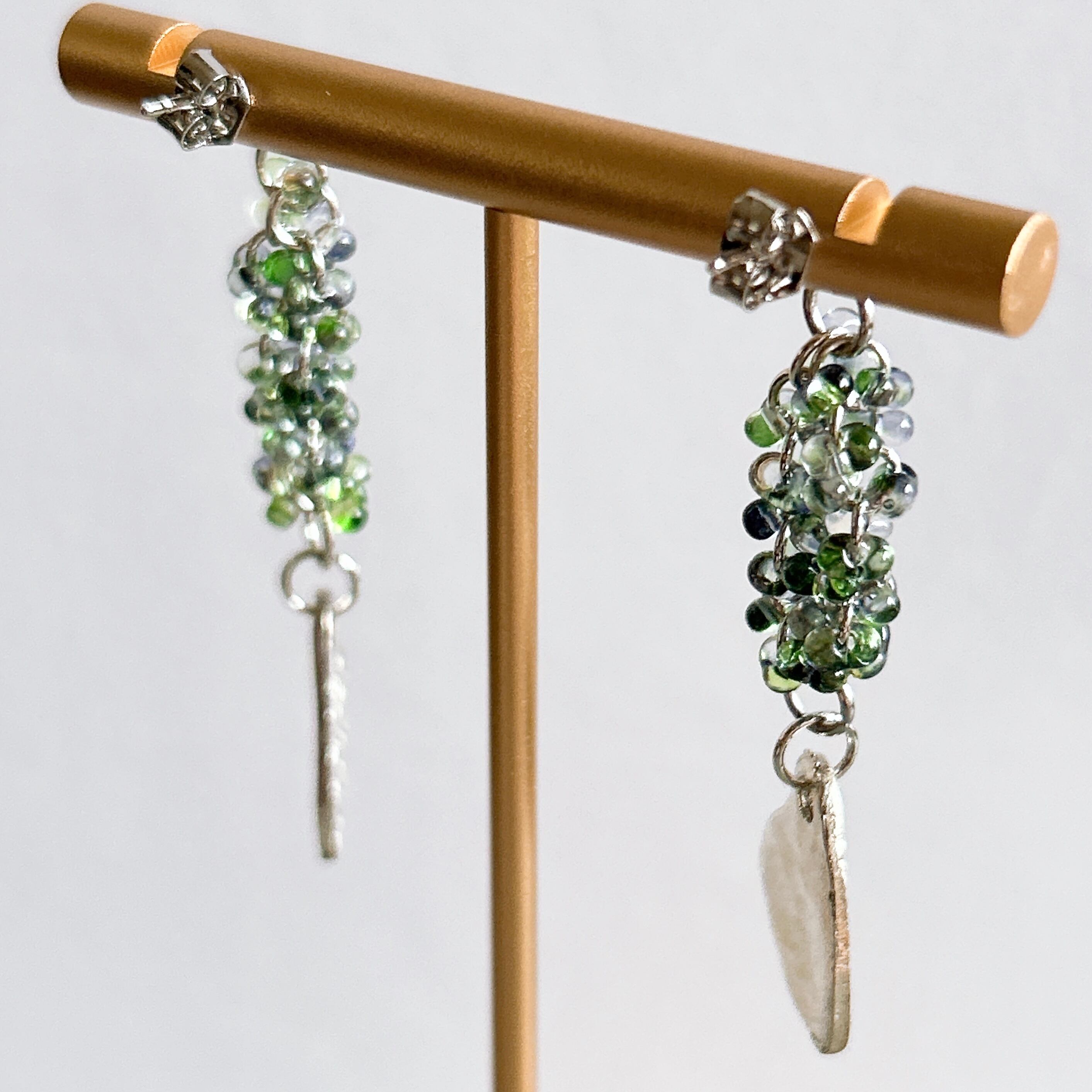 透明感のあるグリーンのファルファーレビーズを繊細に連ねた、耳で優雅に揺れるピアスです。